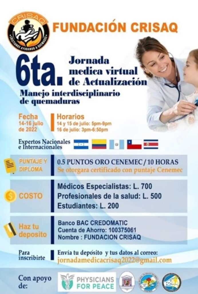 Cabe señalar, que CRISAQ es el primer y único centro de rehabilitación que atiende gratuitamente a niños y adultos afectados por quemaduras graves, por lo que se ha convertido en un soporte solidario para los hondureños y en la sexta jornada médica virtual de manejo interdisciplinario de quemaduras, busca para los profesionales que atienden a pacientes con quemaduras una actualización de sus conocimientos con la participación de los más prestigiosos científicos con entrenamiento y conocimiento sobre el tema.