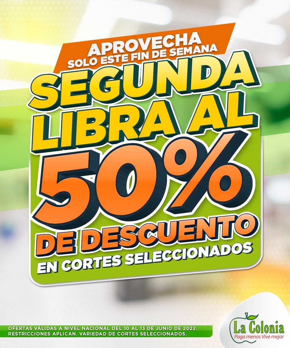 Te esperamos del 10 al 13 de junio, en las 57 tiendas a nivel nacional o canales digitales: www.lacolonia.com, app y WhatsApp marcando al 9474-9030, para que aproveches del 50% de descuento real en la segunda libra de los mejores cortes seleccionados en carnes de res, cerdo y embutidos.