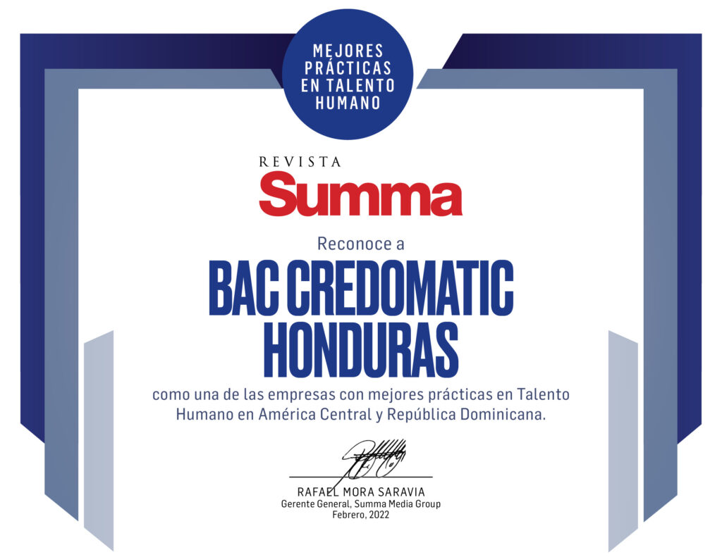BAC Credomatic Honduras, resalta nuevamente por su acertada estrategia en la gestión de su capital humano, con modelos híbridos de trabajo, incentivando la diversidad social y otorgando las mejores oportunidades de formación profesional. La revista latinoamericana Summa, reconoce a BAC Credomatic como el banco número uno en Honduras, en el ranking de las mejores empresas en la Gestión del Talento Humano.