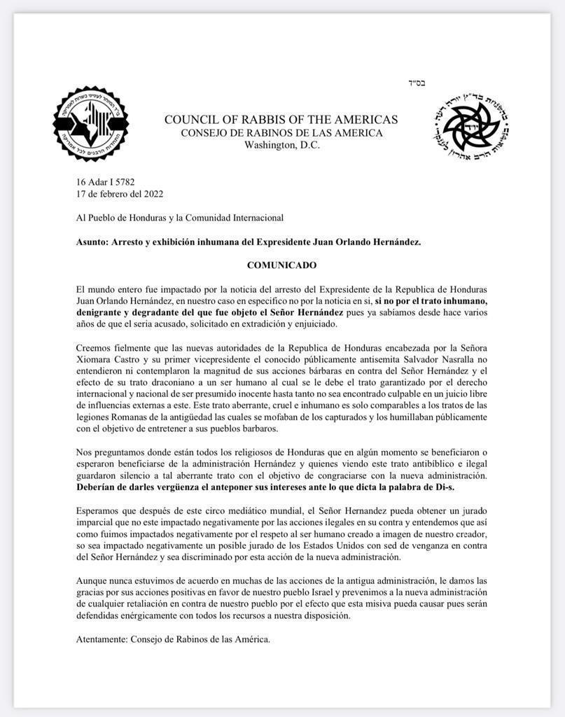 Consejo de Rabinos de las Américas con sede en Washington condena el trato inhumano contra el expresidente Juan Orlando Hernández