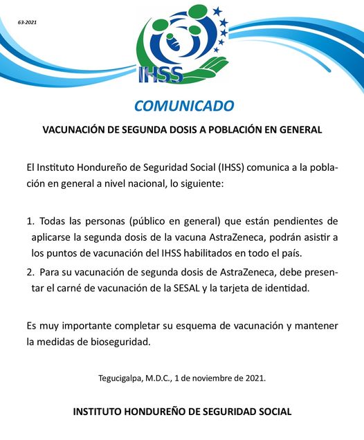 El Instituto Hondureño de Seguridad Social (IHSS), a través de la coordinadora de Vigilancia, la doctora Clara Victoria Nolasco, informó hoy, que se vacunará con segunda dosis de AstraZeneca a la población no afiliada.