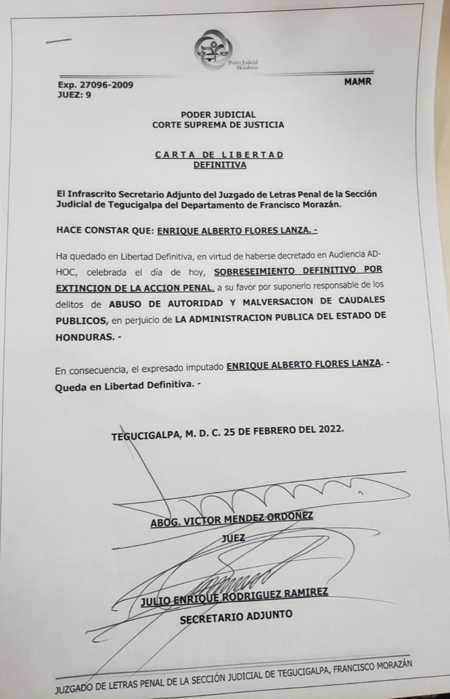 Bajo amnistía aprobada por el Congreso Nacional, el exministro de la presidencia en el gobierno de Manuel Zelaya, Enrique Flores Lanza, obtiene su carta de libertad.