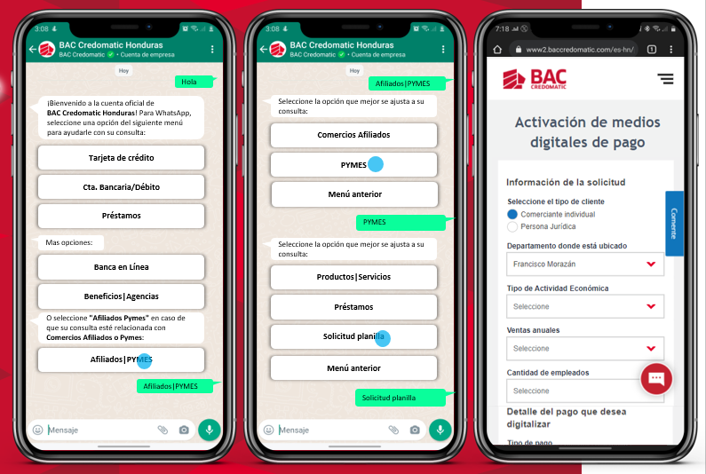 Honduras, marzo 2022. En búsqueda de ser un banco más accesible, BAC Credomatic le apuesta a la atención al cliente a través de la mensajería digital. Desde el 2017, la institución financiera brinda una atención vía WhatsApp Business, permitiéndole ser más flexible con sus clientes. Por la innovación que los caracteriza y la búsqueda constante de mejorar la experiencia al cliente, BAC Credomatic es la primera empresa en Honduras en emplear en su chatbot los botones interactivos para una navegación más intuitiva y visualmente más atractivo.