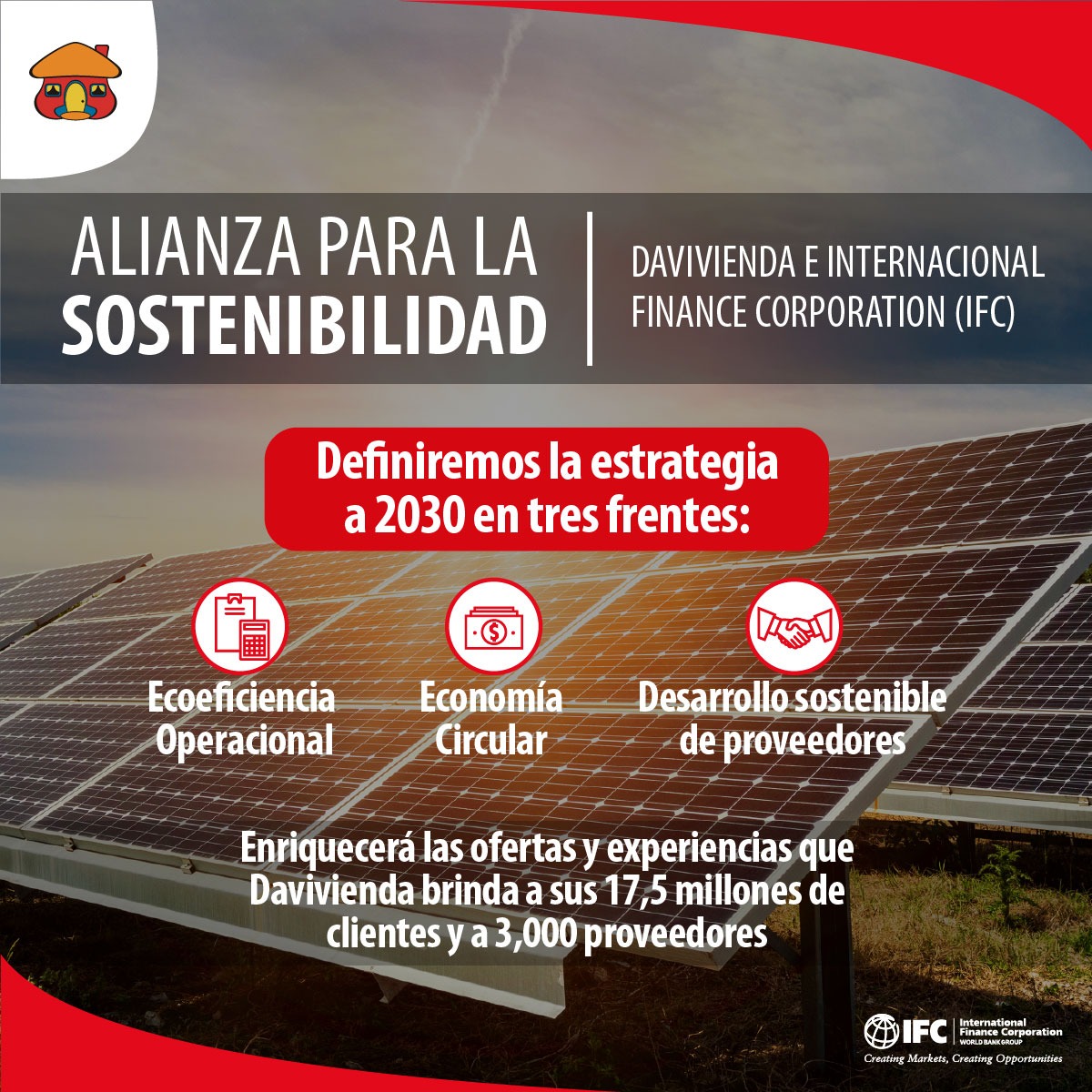 Davivienda y la International Finance Corporation (IFC), crearon una alianza estratégica para desarrollar el primer proyecto de ecoeficiencia operacional y economía circular para Colombia y Centroamérica, con el fin de enriquecer las ofertas, servicios, productos y experiencias que Davivienda brinda a sus 17,5 millones de clientes y a 3.000 proveedores, esta es basada en la cadena de valor, clientes y productos, alineados con estándares internacionales, políticas presentes en cada país y ODS, dando paso a impactos positivos y convirtiendo a la entidad financiera en pionera y referente en Colombia y en la región.
