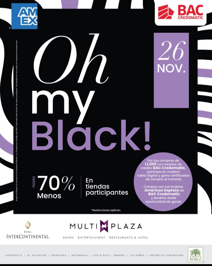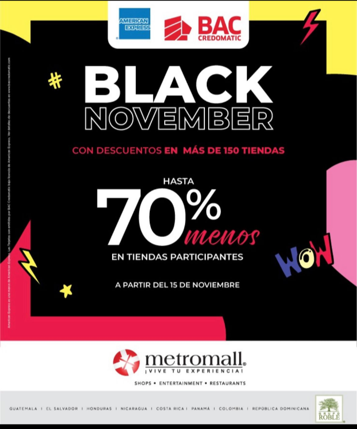 Grupo Roble presenta su campaña «Oh My Black» en Multiplaza y «Black November» en Metromall, las cuales consisten en que del 15 al 28 de Noviembre los visitantes de los tres centros comerciales encontrarán los mejores descuentos, ofertas y promociones de año y asi podrán realizar sus compras navideñas desde ya en los mejores comercios y en un ambiente seguro y cómodo.