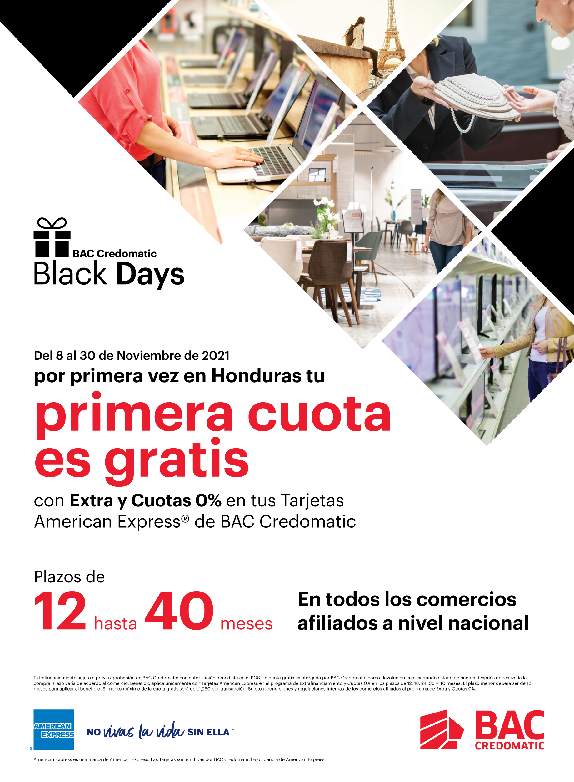 La promoción Black Days de BAC Credomatic, aplica para las diferentes tarjetas de crédito American Express emitidas en Honduras, bajo las siguientes condiciones: