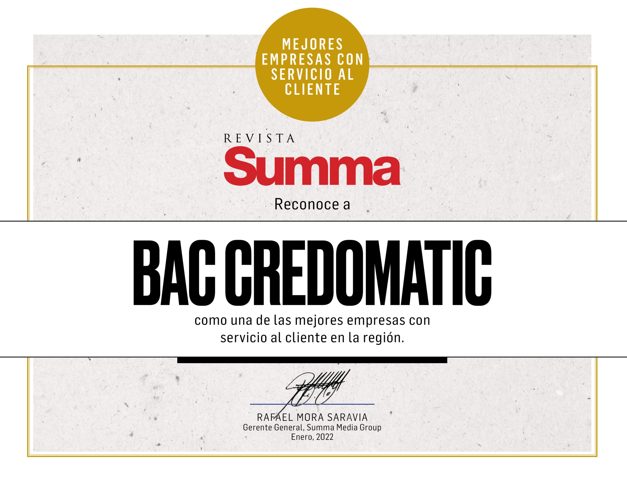 Como resultado de la correcta ejecuciónde su estrategia, BAC Credomatic es reconocido por la Revista Summa como el banco número uno en Honduras, en la categoría de Servicio al Cliente. Esta posición es el resultado del sondeo propio que realiza la revista para conocer cuáles son las empresas mejor valoradas en el ámbito de servicio al cliente en la región.